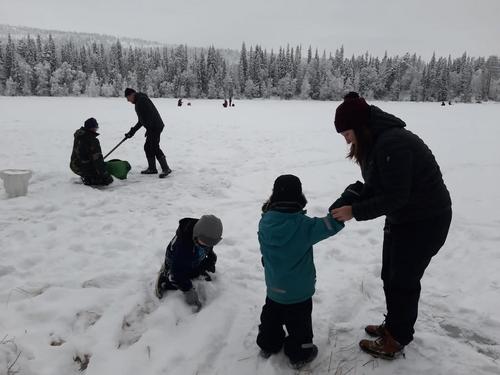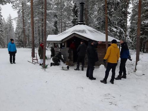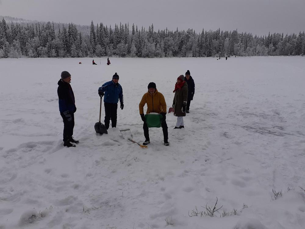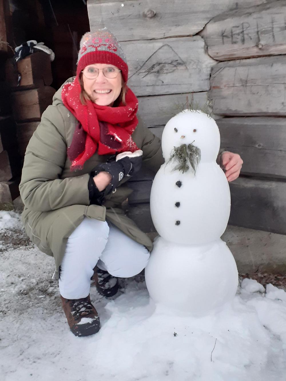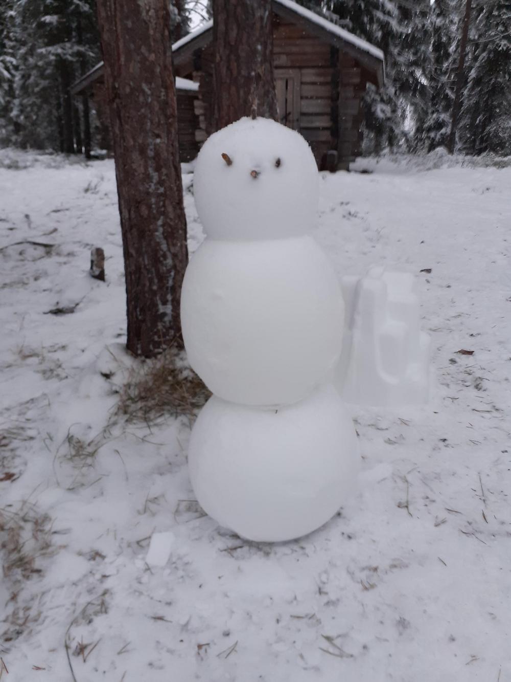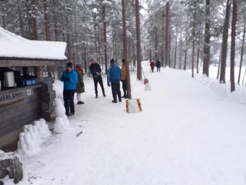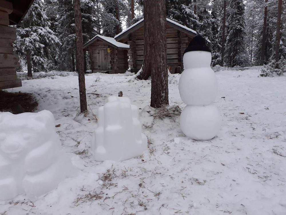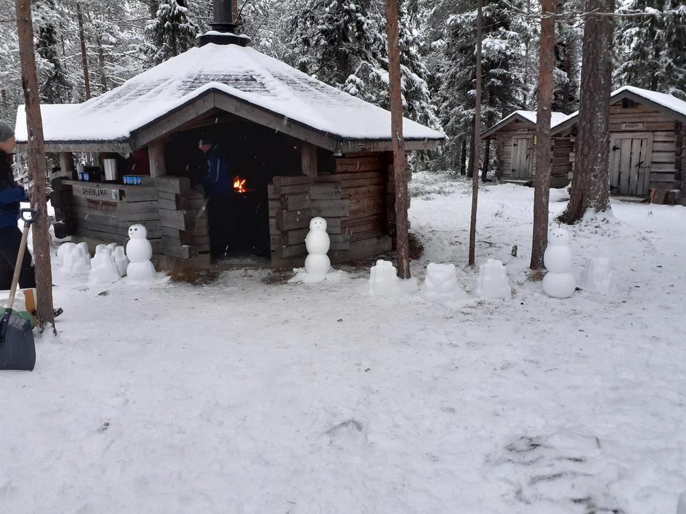 Ahvenlammen jäälle oli onneksi kertynyt muutaman sentin kerros kevyttä pakkaslunta.Sitä keräämällä uuttera talkooporukka sai aikaiseksi Ahvenlammen kodan ympärille joukon pikku hahmoja toivottamaan joulun ja jouluvieraat tervetulleiksi.