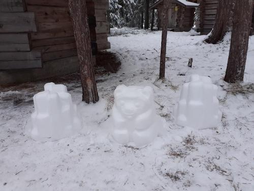 Olipas vähällä ettei lumipuistotalkoista olisi tullut lumentekotalkoot. Lumen vähyyden vuoksi jouduimme tinkimään tavoitteista ja tyytymään lumikirkon yms. isompien rakennelmien sijaan kooltaan vaatimattomampiin luomuksiin.