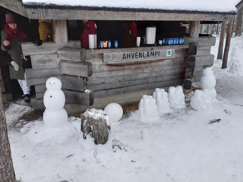 Ahvenlammen jäälle oli onneksi kertynyt muutaman sentin kerros kevyttä pakkaslunta.Sitä keräämällä uuttera talkooporukka sai aikaiseksi Ahvenlammen kodan ympärille joukon pikku hahmoja toivottamaan joulun ja jouluvieraat tervetulleiksi.