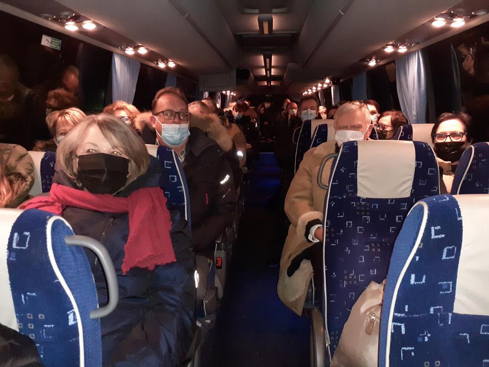 Korona-pandemian vaatimien turvallisuusjärjestelyjen vuoksi bussimatkat tehtiin maskitettuna.